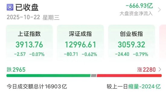 10月22日,A股三大指数集体调整。截至收盘,上证指数跌0.07%、深证成指跌0.62%、创业板指跌0.79%。全市场全天成交额16903亿元,较上个交易日缩量2024亿元。