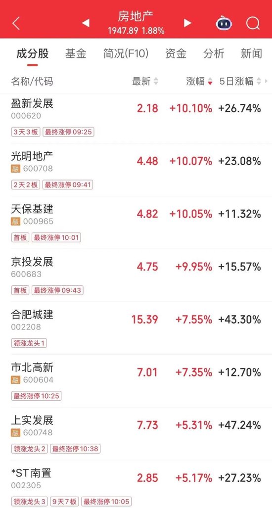 今日,房地产板块表现活跃。盈新发展实现“三连板”,光明地产、天保基建、京投发展等多股涨停。