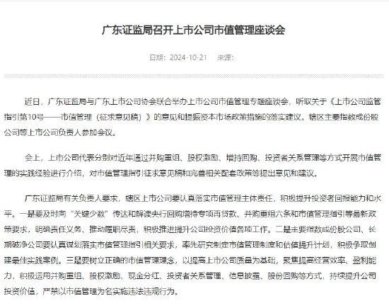 广东证监局近日与广东上市公司协会联合举办上市公司市值管理专题座谈会。广东证监局有关负责人要求,辖区上市公司要认真落实市值管理主体责任,积极提升投资者回报能力和水平。一是要及时向“关键少数”传达和解读央行回购增持专项再贷款、并购重组六条和市值管理指引等最新政策要求,明确责任义务、推动履职尽责,积极推进提升公司投资价值各项工作。二是主要指数成份股公司、长期破净公司要认真谋划落实市值管理指引相关要求,率先研究制定市值管理制度和估值提升计划,积极争取创建最佳实践案例。三是要树立正确的市值管理理念,以提高上市公司质量为基础,聚焦提高经营效率、盈利能力,积极运用并购重组、股权激励、现金分红、投资者关系管理、信息披露、股份回购等方式,持续提升公司投资价值,严禁以市值管理为名实施违法违规行为。
