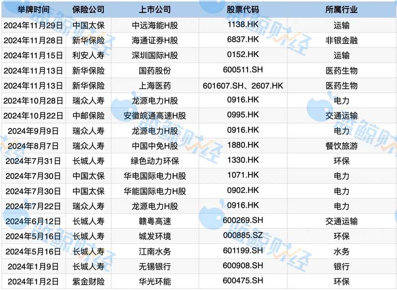 此外,今年以来,还有中邮保险举牌安徽皖通高速H股(0995.HK),利安人寿举牌深圳国际H股(0152.HK)等。