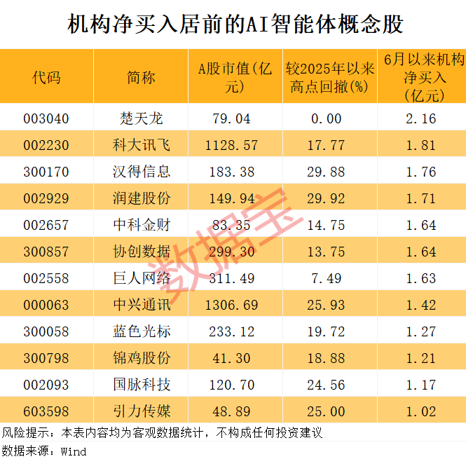 从资金流向来看,6月以来机构资金净买入超亿元的AI智能体概念股有12只,其中楚天龙机构净买入额最高,达到2.16亿元。楚天龙身兼多重题材,包括5G概念、华为鸿蒙、人工智能、数字货币、DeepSeek等。公司近期接受机构调研时透露,在数字人民币领域,公司与8家二层运营机构、华为等优秀行业合作方紧密合作,2024年积极探索并推动数字货币桥落地场景、智能合约设计、跨境结算优化等项目。