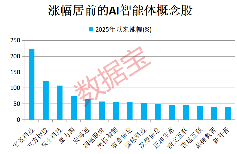 据证券时报·数据宝统计,今年以来多只AI智能体概念股受到市场热捧。截至6月9日收盘,概念股平均上涨14%,大幅跑赢同期上证指数;宏景科技、立方控股、东土科技3股累计涨幅翻倍。