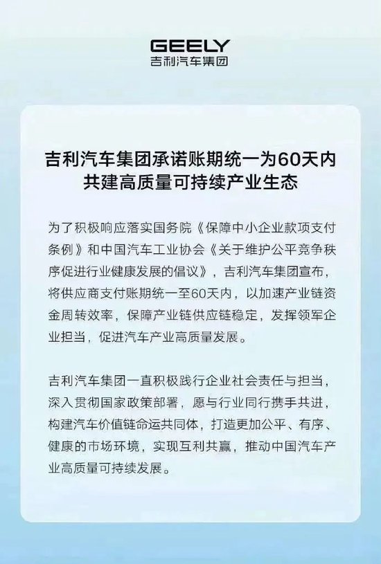 多家汽车巨头在6月10日晚集体发声,承诺供应商账期不超过60天。中国一汽明确将“60天付款”作为所属单位硬性要求,东风汽车宣布统一支付账期至60天内,广汽集团承诺保障供应链资金高效周转,赛力斯则宣称其早已执行60天账期标准。