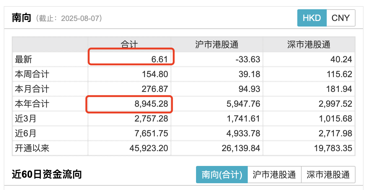 南向资金已连续三个交易日净买入,8月5日至7日净买入金额分别为234.26亿港元、94.85亿港元、6.61亿港元。