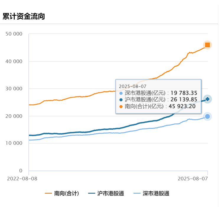 南向资金总规模已然十分庞大。截至8月7日,自港股通开通以来,南向资金净流入4.59万亿港元。