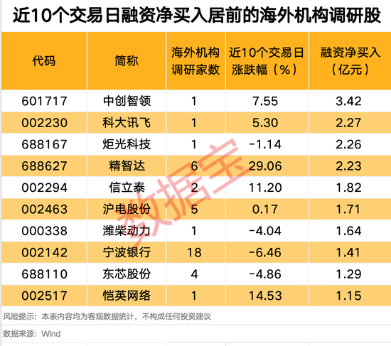 从资金面来看,近10个交易日超半数海外机构调研股获得融资客加仓,其中10股获得融资净买入均超亿元。中创智领、科大讯飞、炬光科技、精智达等股的净买入额居前,中创智领累计获得3.42亿元净买入,居首。