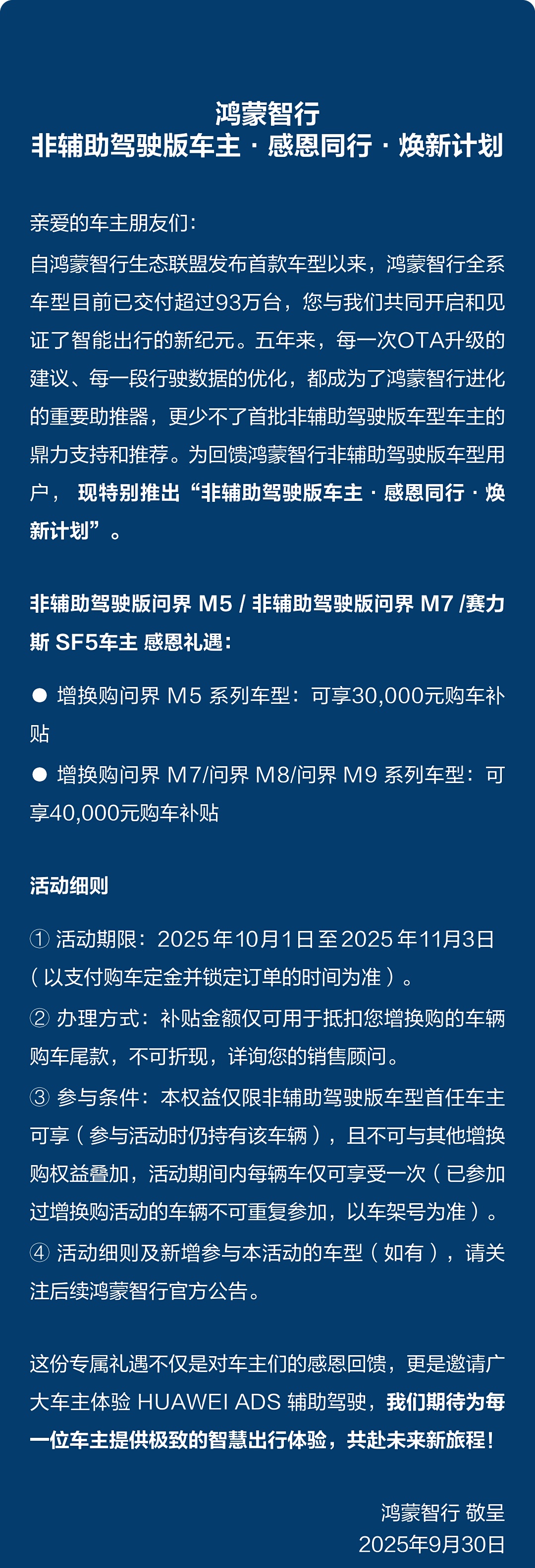 IT之家附鸿蒙智行“非辅助驾驶版车主・感恩同行・焕新计划”如下: