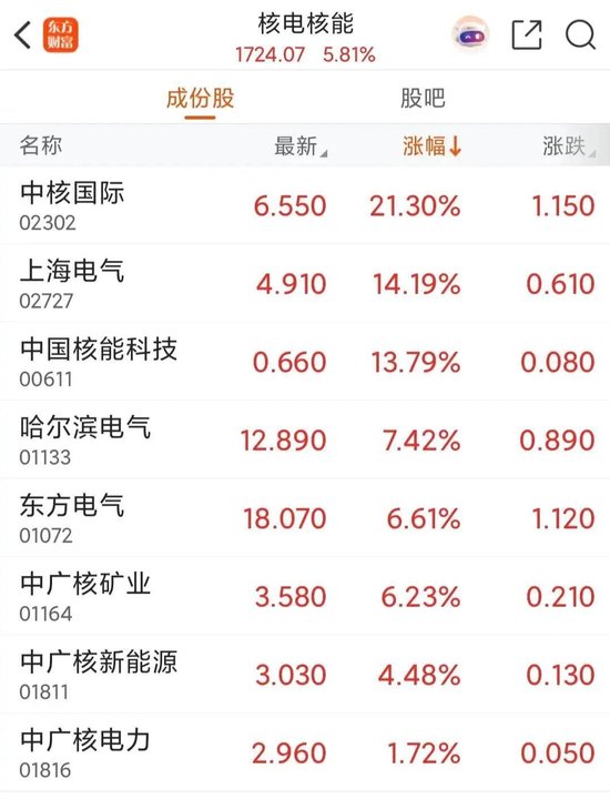 10月3日,港股三大指数调整,核电核能概念股逆势集体爆发,截止收盘,中核国际涨21.30%,上海电气涨14.19%,中国核能科技涨13.79%,哈尔滨电气、东方电气等跟涨。