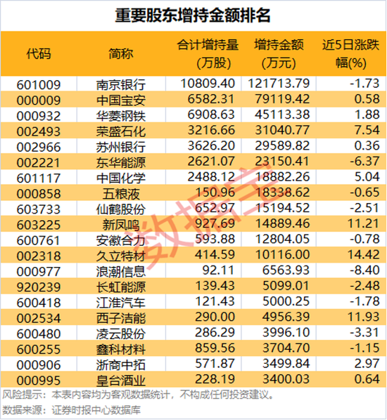 从增持金额看,近5日增持金额在1亿元以上的有12家,增持金额最多的是南京银行,其间累计增持1.08亿股,增持金额合计12.17亿元;其次是中国宝安,增持量为6582.31万股,增持金额7.91亿元;华菱钢铁近5日获股东增持4.51亿元,增持金额位居第三。