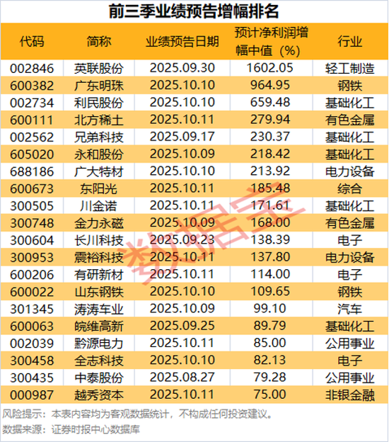英联股份预计净利润增幅最高,预计前三季度实现净利润增幅中值为1602.05%;广东明珠、利民股份预计前三季度净利润同比增幅中值分别为964.95%、659.48%,位列第二、第三。