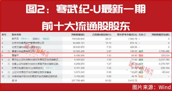 寒武纪-U是人工智能芯片领域的龙头企业,受益于人工智能的快速发展,公司不但扭亏为盈,且业绩迎来快速增长,也因此公司股价持续上行,一度超越贵州茅台成为A股中最贵的股票。在今年三季度期间,寒武纪-U的前十大流通股股东多数发生了持仓变动,且以兑现为主对公司进行了不同程度的减持,而章建平就是其中的一个逆行者,持有公司股票数量增加了32万股(见图2)。