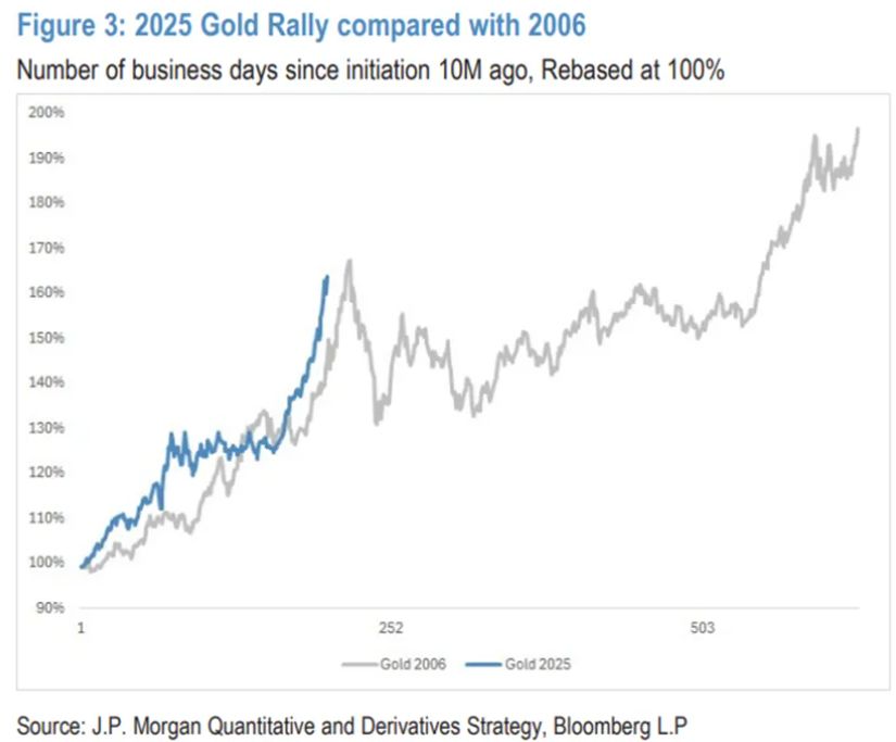 摩根大通量化与衍生品策略团队指出,黄金ETF期权市场出现了创纪录的空头Gamma失衡,且本轮金价的涨势无论在幅度还是速度上,都与2006年市场见顶回调前的情景高度相似,当时金价在暴涨后经历了一场30%的深度回调。