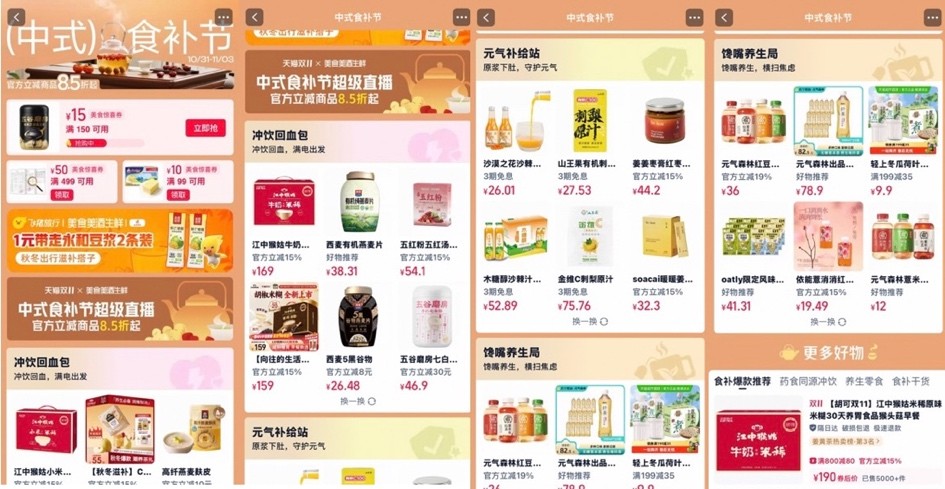 为更好承接这一消费趋势,今年天猫双11,淘宝天猫食品生鲜行业推出“中式食补节”活动,主打“情绪营销”,通过内容种草等方式,为消费者挑选出兼具功能性与便捷性的“新中式养生”商品。同时,围绕这些特色供给组织食补直播专场,通过内容与场景联动,也帮助商家获得生意增长。