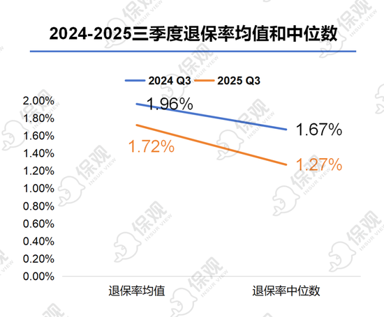 2025年三季度,57家人身险公司退保率均值为1.72%,较2024年同期的1.96%下降了0.24个百分点;同时,2025年三季度人身险公司的退保率中位数为1.27%,同样较2024年同期的1.67%下降了0.4个百分点。