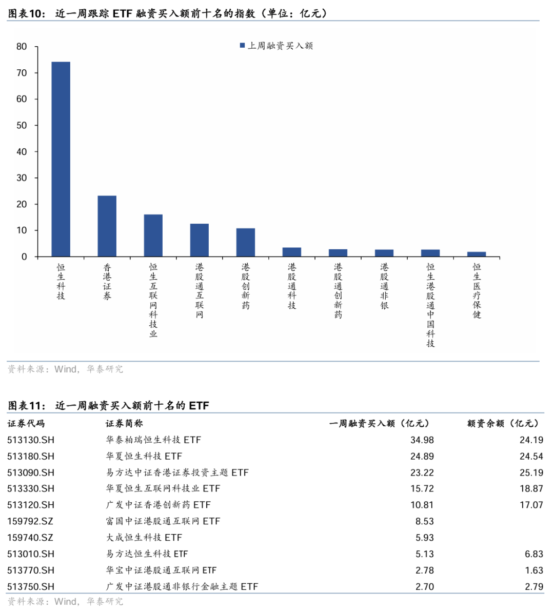 上周跟踪ETF成交额前五名的指数为恒生科技、香港证券、港股通互联网、恒生互联网科技业、港股创新药,周度成交额分别为546.01、180.79、168.83、117.57、113.15亿元。上周成交额前五名的ETF分别为华泰柏瑞恒生科技ETF、易方达中证香港证券投资主题ETF、华夏恒生科技ETF、富国中证港股通互联网ETF、广发中证香港创新药ETF,成交额分别为201.38、180.79、169.19、119.74、113.15亿元。