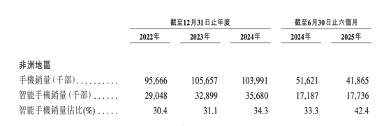 传音控股港股招股书显示,2022年、2023年、2024年和2025年上半年,传音手机在非洲地区销量中,智能手机销量占比分别为30.4%、31.1%、34.3%和42.4%。智能手机销量占比较低,单价50元上下的功能机占据了更大比重。