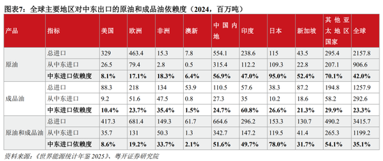 中东不仅是重要的产油区,更是重要的石油净出口国,2024年原油出口占全球42%。从石油出口流向看,中东石油出口高度集中于亚洲;从石油进口看,日本对中东石油进口依赖度高达95%,中国、印度、新加坡等依赖度均在50%左右,欧美依赖度则普遍低于20%。成品油、液化天然气(LNG)依赖度格局与原油相似。