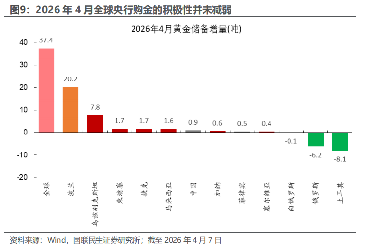 其四,央行对购金仍具较高的积极性。2026年4月全球央行购金规模达到37.4吨,其中波兰、乌兹别克斯坦、柬埔寨、捷克、马来西亚为核心增量,反映全球央行“购金”的总基调并未发生改变,土耳其、俄罗斯等少数央行抛售黄金“无伤大雅”。